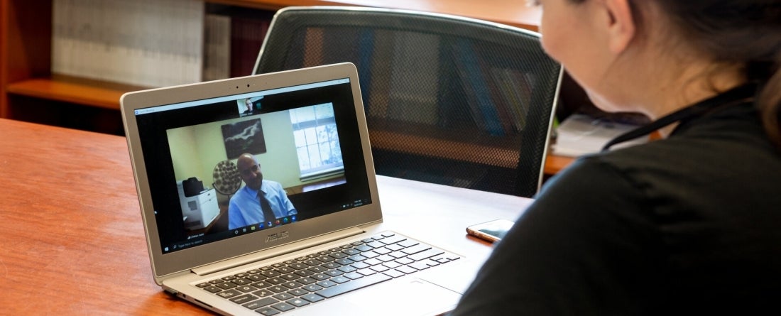 A girl on a virtual zoom meeting.