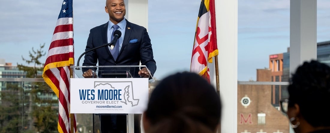 Moore, a former nonprofit executive, veteran and author, will be Maryland’s first Black governor. He was joined at the event by his running mate, lieutenant governor-elect Aruna Miller, as well as UMD officials such as President Darryll J. Pines, School of Public Policy Dean Robert Orr and Eric Luedtke, the Maryland House majority leader and an associate clinical professor at the university.