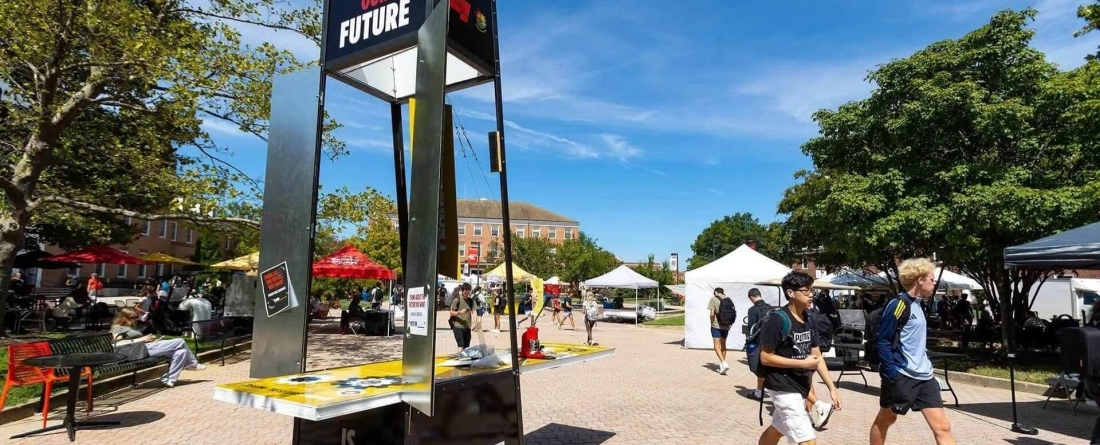 The structure, shaped like a voting booth, was built by UMD faculty, alums and students from the School of Architecture, Planning and Preservation, in collaboration with TerpsVote, Arts for All, the College of Arts and Humanities, The Clarice Smith Performing Arts Center and the Maryland Democracy Initiative. Created as part of the Design and Democracy course, the goal of the installation is to spark civic engagement by making voting less intimidating for new voters.